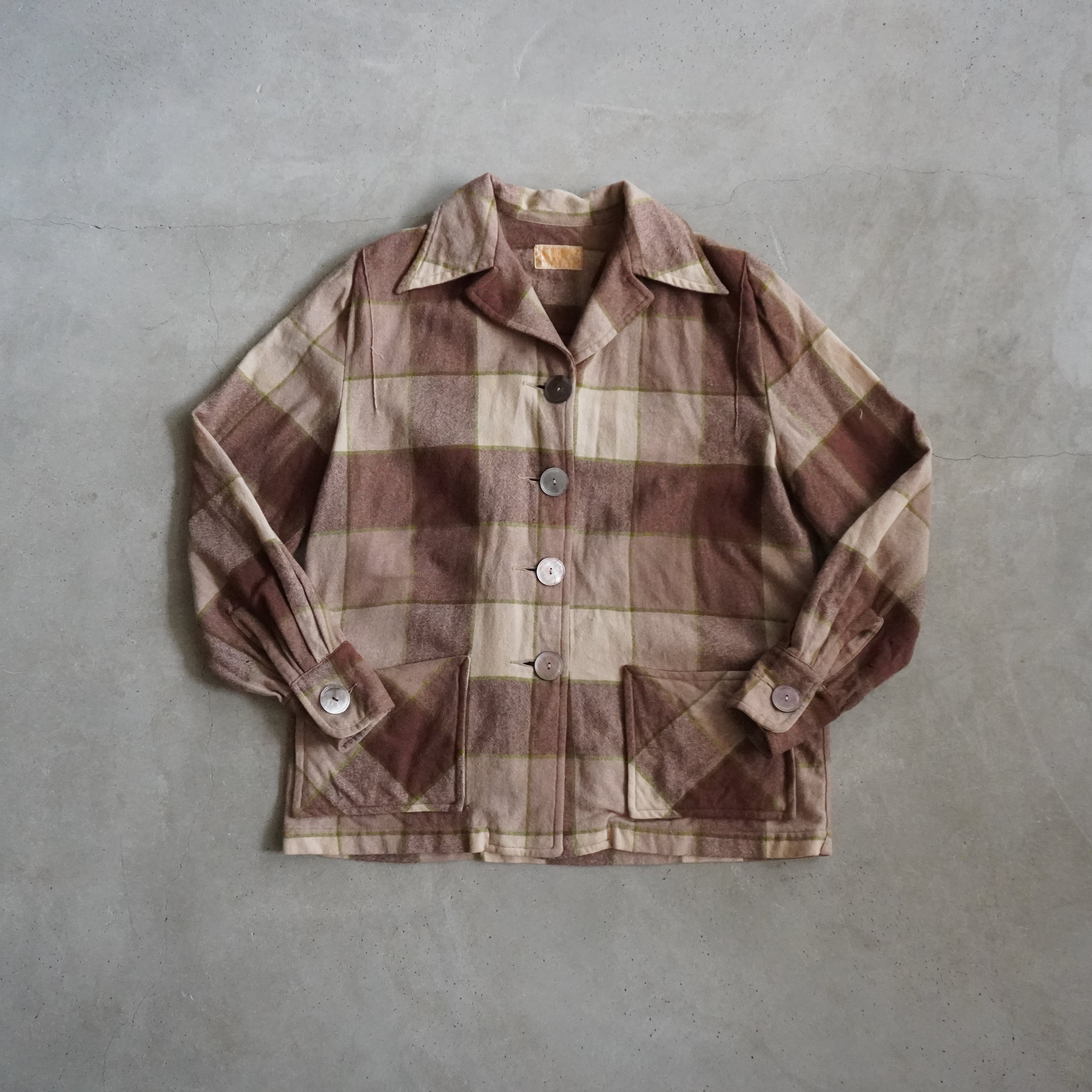 柔らかいブラウンカラーチェックと大きめのシェルボタンが可愛いです