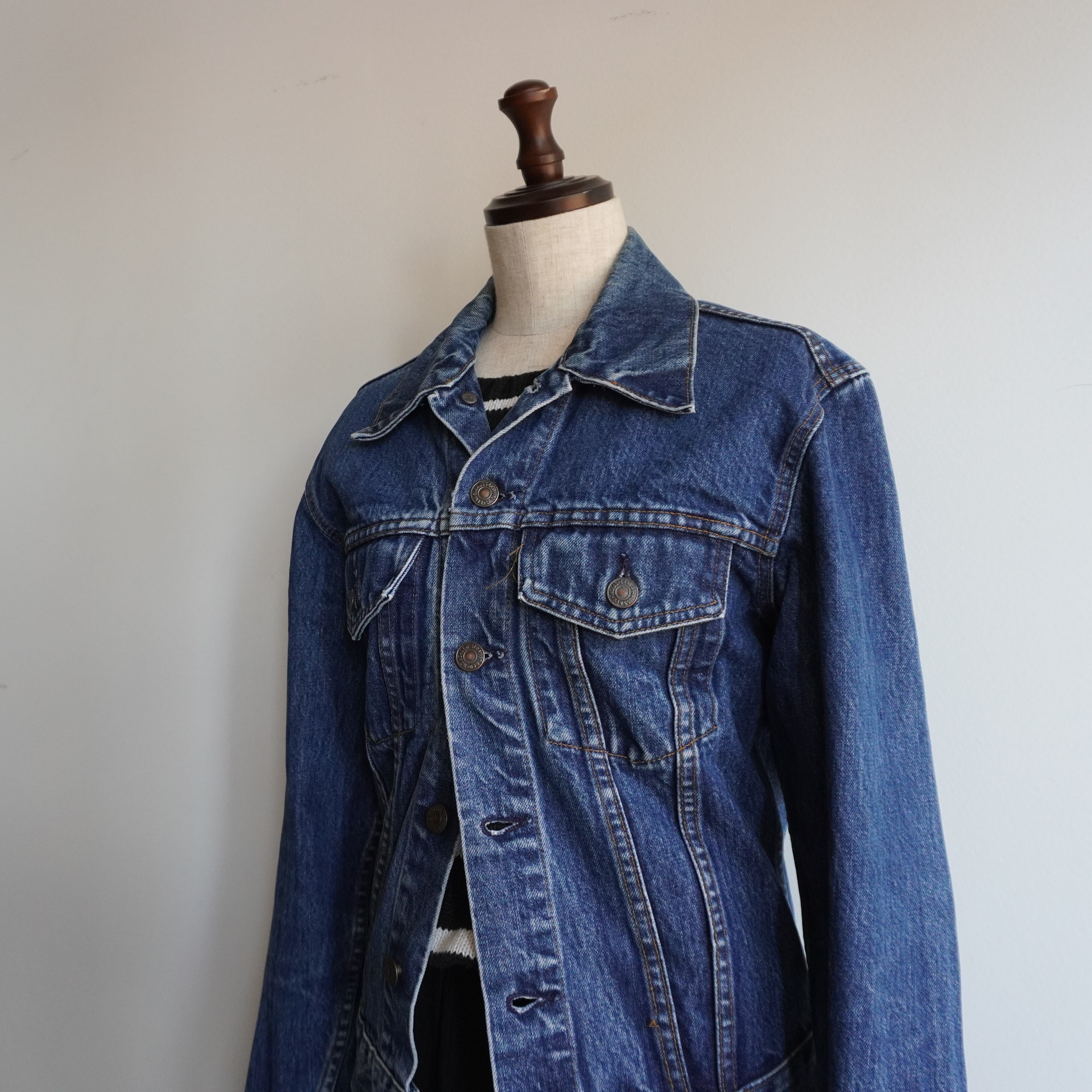 カラーは濃いめのインディゴです。色落ちしている部分もあり古着らしい雰囲気があります◎