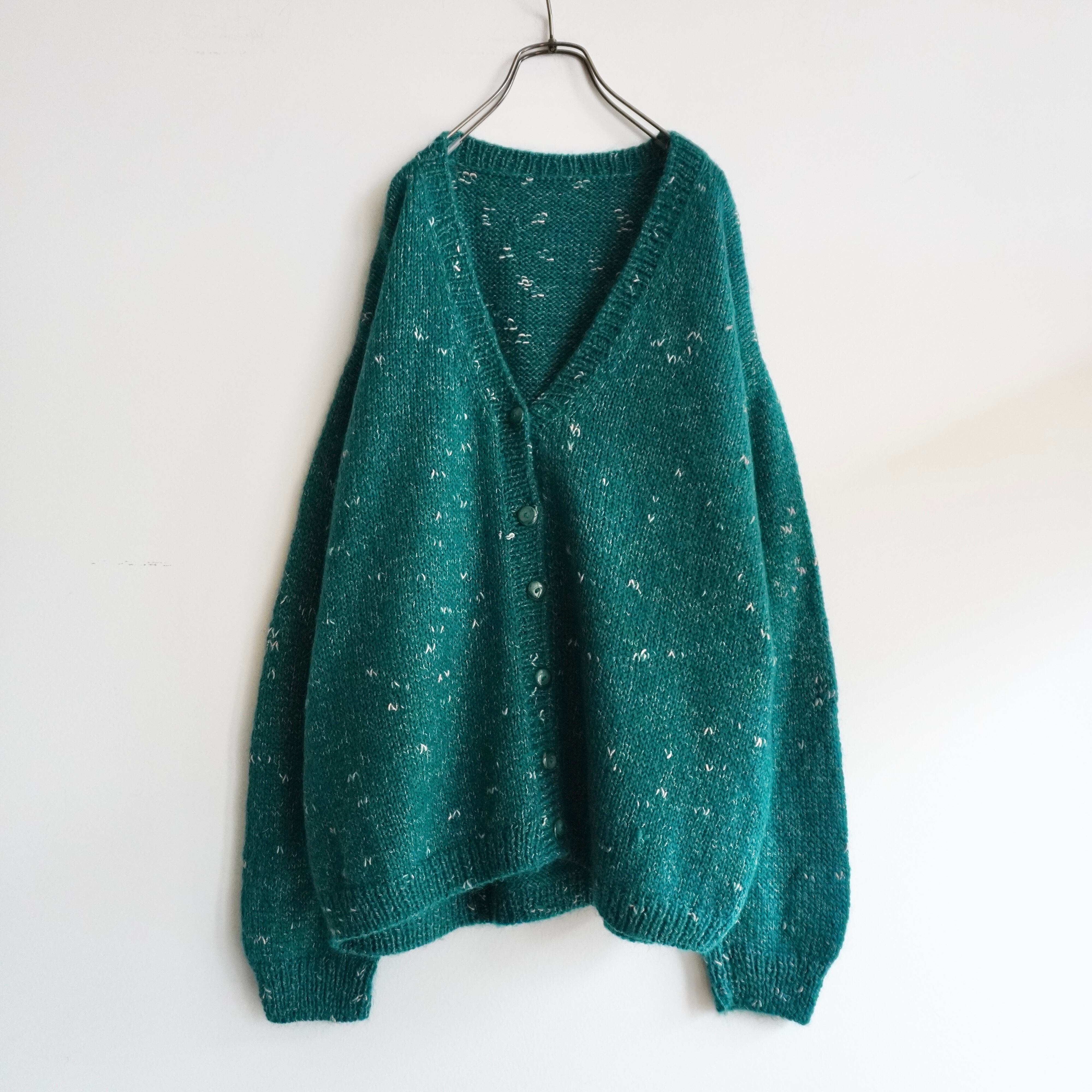 鮮やかなグリーンのニットカーディガン
