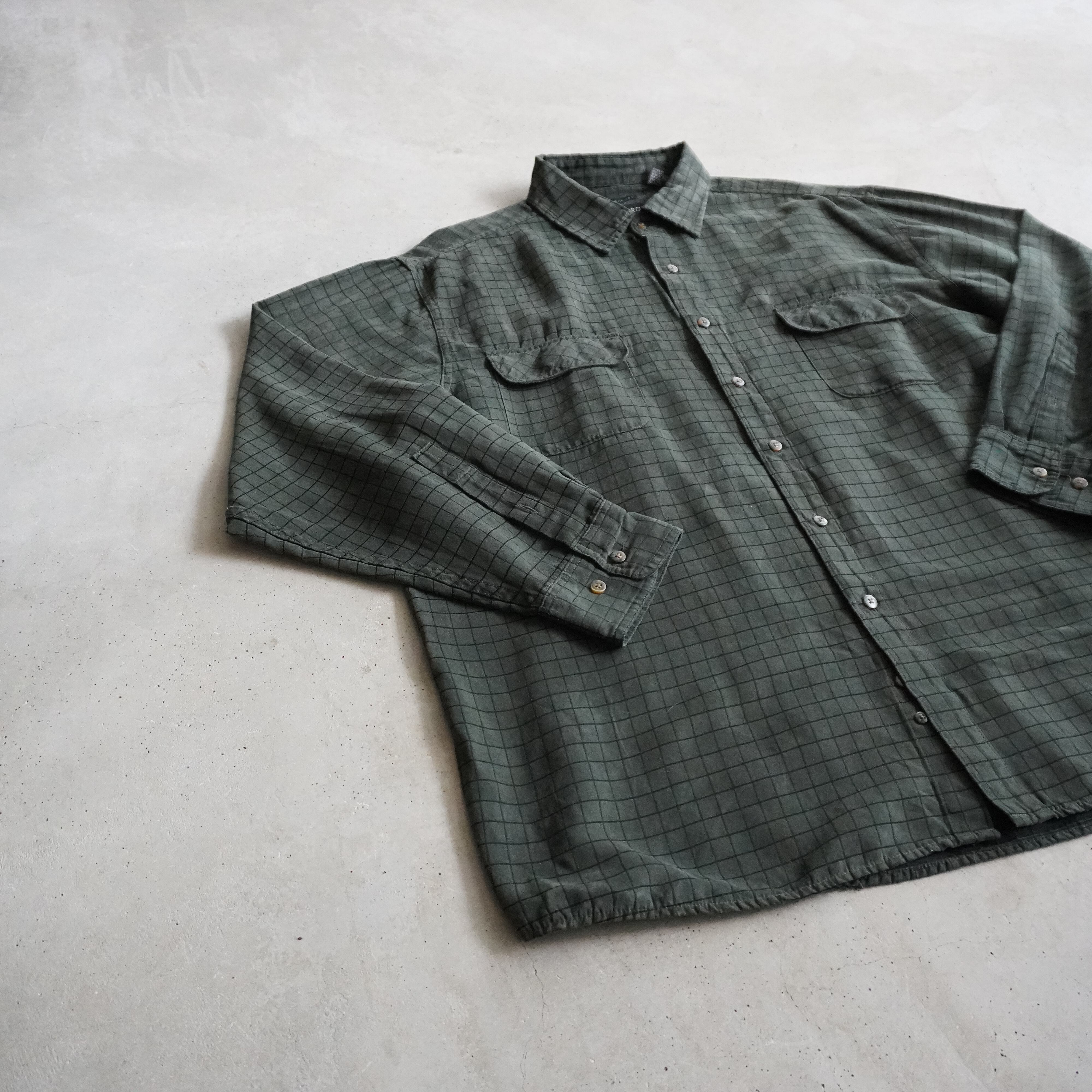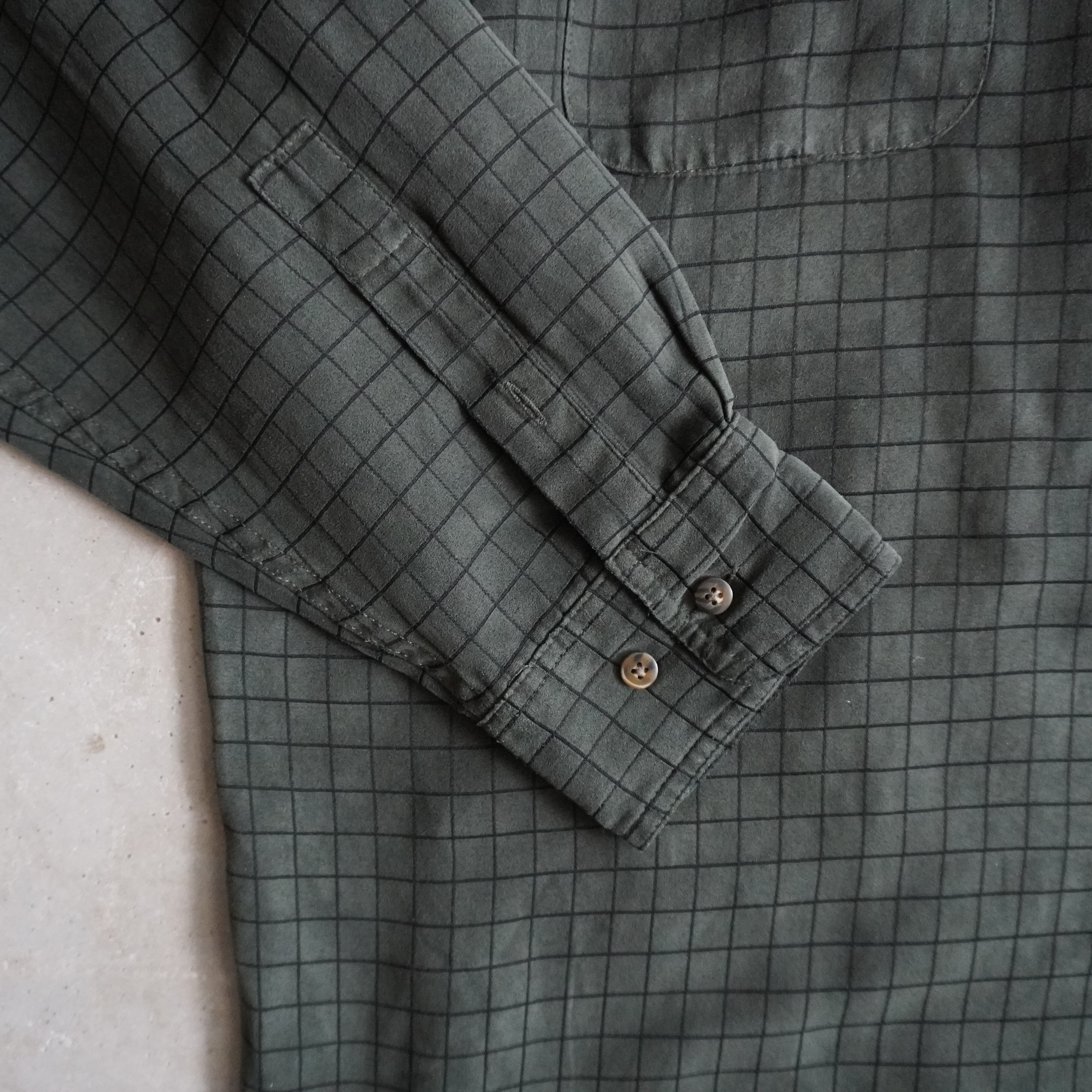 深みのあるグリーンにブラックの模様が施されたフェイクスエードシャツ